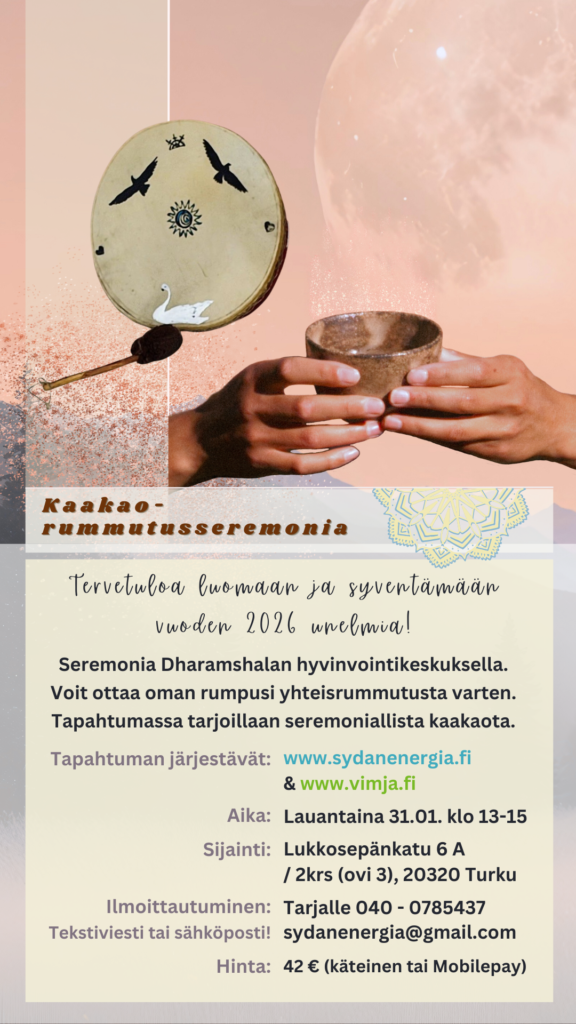 Ota yhteyttä sähköpostitse, jos haluat tilata kaakaoseremonian. Kaakaoseremonia on hieno tapa juhlistaa erilaisia merkkitapahtumia, kuten syntymäpäiväjuhlia, ”mother blessing” eli äidiksi tulemista juhlistavia kokoontumisia, tai esimerkiksi firman tai harrastusporukan vapaa-ajan viettoa. Kaakaoseremonia voi olla myös hieno ja tunnelmallinen lisä osana järjestämääsi tapahtumaa. Nämä seremoniat kestävät 1-3 tuntia sisällöstä riippuen; voimme räätälöidä kaakaoseremonian sisältöä tarpeidesi mukaan. Kysy hintatarjousta!